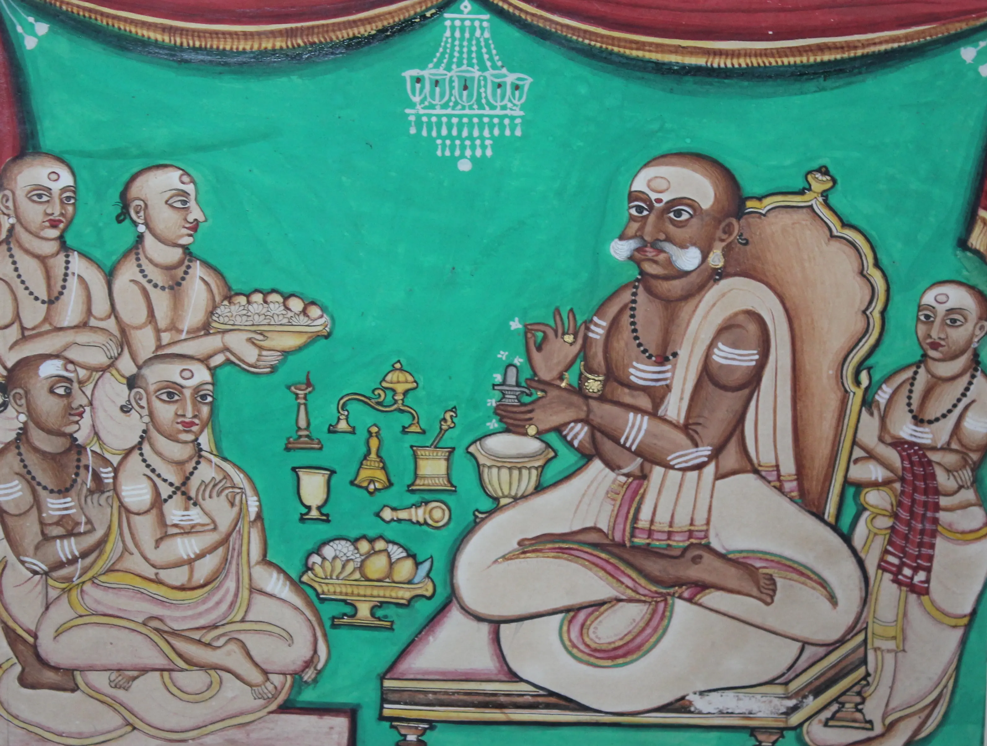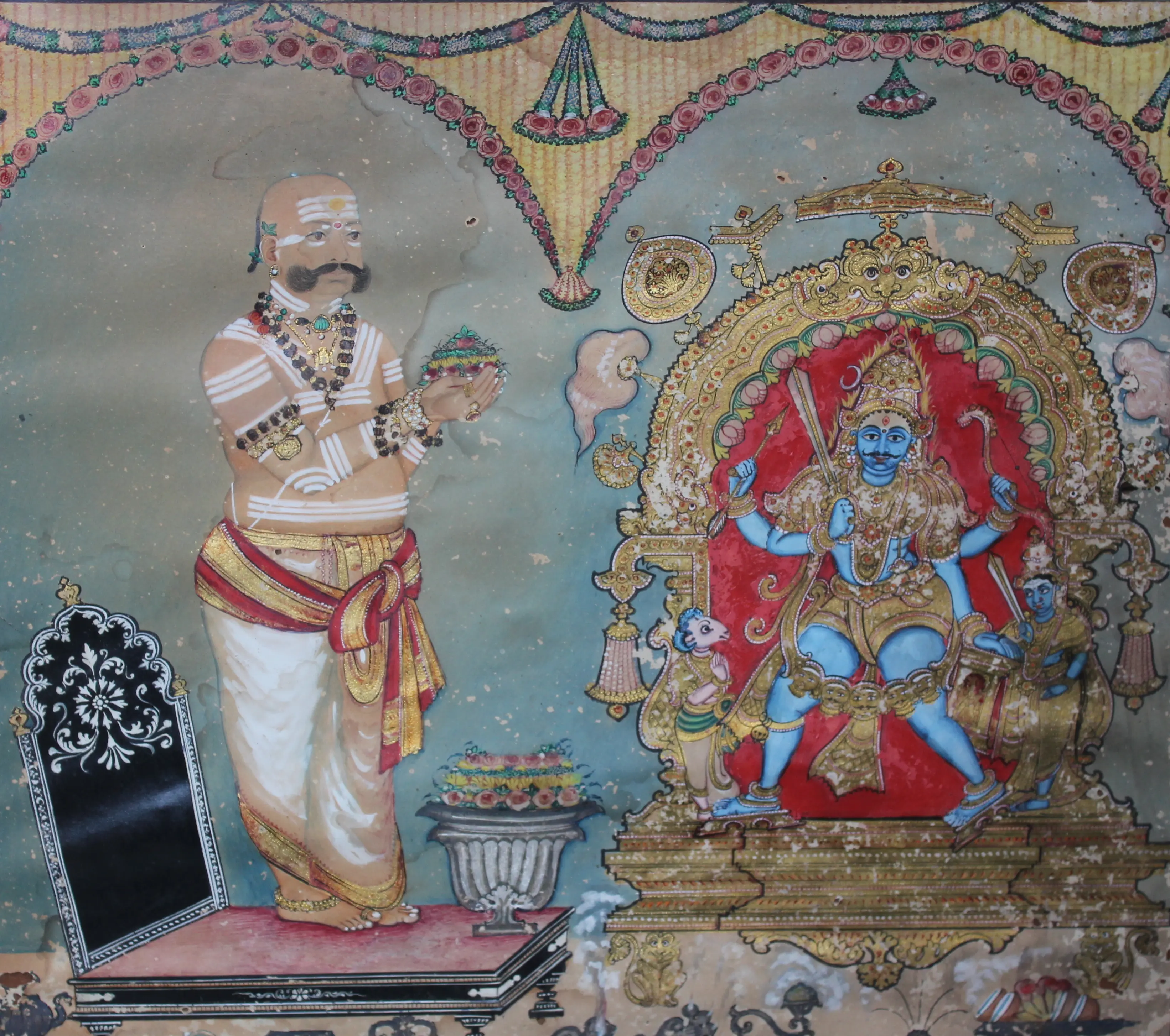The bonds between Kr̥ṣṇarāja III and Vīraśaiva-Liṅgāyat community were further strengthened through the production and circulation of portraits of the king, a common practice of the Mysore kings to display devotional preferences and alliances in early modern and colonial period (Simmons 2020). Kr̥ṣṇarāja III’s devotional imagery was far more extensive than his predecessors, including paintings and prints, ranging from large murals to frontispieces of mass-produced books, of the king conducting rituals that were circulated throughout his kingdom and abroad. While most of the devotional images of Kr̥ṣṇarāja III focused on the goddess Cāmuṇḍēśvari or Śrī Vaiṣṇava practice, several extant portraits portray the king wearing the outward signs of Vīraśaiva-Liṅgāyat devotion, a personal iṣṭaliṅga (figure 1), and conducting Vīraśaiva-Liṅgāyat ritual to his personal liṅga (figure 3). Through this display of his pious practice Kr̥ṣṇarāja III incorporated the Vīraśaiva-Liṅgāyat practice within the royal ritual repertoire, projecting his new persona as the Hindu king and the king for all Hindus for both his subjects and his British overlords, regardless of whether or not Vīraśaiva-Liṅgāyats considered themselves to be part of his Hindu fold (see Simmons 2020).